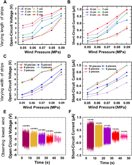 Figure 3. Examining the optimum length of the PTFE strips under different weak winds showing (A) Open-circuit voltage and (B) Short-circuit current; Examining the optimum width of the PTFE strips under different weak winds showing (C) Open-circuit voltage and (D) Short-circuit current (E) Open-circuit voltage and (F) Short-circuit current for observing the minimum wind pressure.