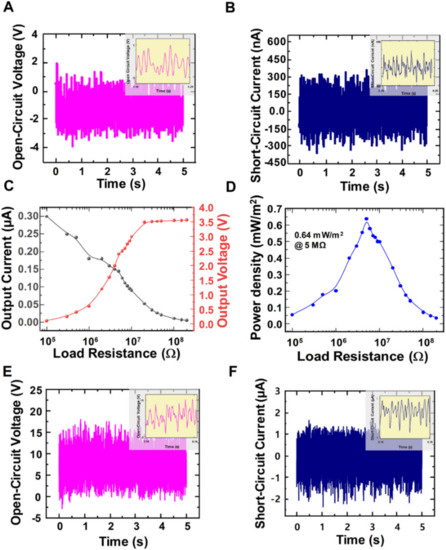 Figure 4. (A) Open-circuit voltage and (B) Short-circuit current at the minimum operating wind pressure of 0.05 MPa. (C) Load resistance dependency of the output voltage and current at wind pressure of 0.05 MPa. (D) Load resistance dependency of the output power at wind pressure of 0.05 MPa. (E) Open-circuit voltage and (F) Short-circuit current at the high wind pressure of 0.2 MPa.