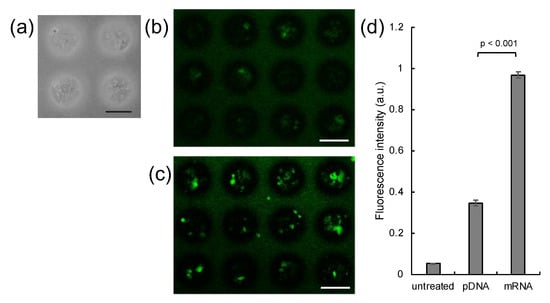 Regarding the introduction of genetic materials to cells for transplantation therapy, viral gene transduction has several potential issues, including complicated manufacturing processes, difficulty in scale-up, high economic costs, limitation in the size of genes, safety concerns, and immune attack to transplanted cells expressing viral proteins [,,,]. Non-viral transfection of plasmid DNA (pDNA) or messenger RNA (mRNA) is a promising option to address these issues. In transfection of 3D cultured cells, transfection capability to non- or slowly-dividing cells is critical, as the cell cycle in 3D culture tends to be slower compared to that in monolayer cultures [,]. In this regard, introduction of pDNA to non-dividing cells is inefficient, because nuclear entry of pDNA is inhibited by the nuclear membrane except when the membrane disappears during cell division [,]. In contrast, mRNA is capable of inducing efficient protein expression even in non-dividing cells [,], which motivates us to use mRNA for gene introduction in 3D cultured cells.