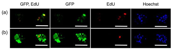 Interestingly, a small but certain number of the EdU-negative cells became GFP-positive after pDNA transfection. This result could be explained by pDNA transfection in non-dividing cells, which occurs at a low efficiency [,]. The result might also be attributed to the labeling method of dividing cells; nuclear transport of pDNA is expected to occur in M phase via disappearance of nuclear membrane [], while EdU staining labeled the cells in S phase. Thus, GFP expression in EdU-negative cells after pDNA introduction may be derived from cells that passed through M phase but not through S phase during the experimental period. Despite this issue, our results revealed that the percentage of GFP positive cells among EdU-negative cells was largely different between mRNA and pDNA introduction (Figure 2 and Figure 3, Table 1 and Table 2).
