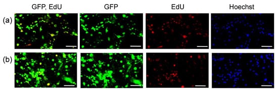 Conversely, pDNA transfection resulted in GFP expression in a large percentage of MSCs in the monolayer culture (Figure 3, Table 2), which divided more frequently than MSCs in spheroids. However, even in the monolayer culture, the percentage of GFP-positive cells in EdU-negative cells following pDNA transfection was low, as was observed in the transfection of spheroids. These results indicate that pDNA transfection is inefficient in non-dividing cells. In contrast, mRNA transfection of MSCs in the monolayer culture allowed for GFP expression in both EdU-positive and negative cells.