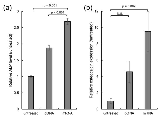 Finally, mRNA transfection was applied to in vitro osteogenic differentiation of MSC spheroids. pDNA and mRNA encoding runt-related transcription factor 2 (Runx2), a strong activator of osteogenic differentiation [,,], was introduced to MSC spheroids four times every 3 days. Osteogenic differentiation of MSCs was evaluated by measuring the enzymatic activity of alkaline phosphatase (ALP) and the level of osteocalcin transcript, well-established markers for osteogenesis [,]. Runx2 mRNA transfection resulted in significantly enhanced levels of ALP compared to Runx2 pDNA transfection and untreated control spheroids, 14 days after the first transfection. Furthermore, osteocalcin transcript level was shown to be significantly increased 21 days after Runx2 mRNA introduction compared to that in untreated control spheroids, while Runx2 pDNA induced only a modest increase in osteocalcin expression compared to the untreated control spheroid, which was not statistically significant. These results suggest that mRNA may have enhanced capability for in vitro cell differentiation compared to pDNA.