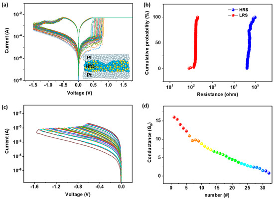 Variation of the switching parameters, including the programming voltages and device resistances in different QC states, is the main cause of performance deterioration in terms of operating reliability and recognition accuracy of the memristor based neural networks. It can be ascribed to the random ion migration in the polycrystalline metal oxide switching matrix, and consequently the stochastic nature of the branch-shaped multiple conductive filament formation, disruption, and regeneration during cyclic operations [35,36]. In order to achieve a more stable and adjustable conductance state for memristor devices, we performed pre-treatment of the HfOx switching layer using the scanning probe microscope based electrochemical lithography technique [37,38]. By stressing voltages onto the hafnium oxide layer through a conductive SPM tip, the highly localized electric field formed under the tip pinpoint region can induce directional migration of the mobile oxygen vacancies towards the tip position, resulting in loss of the local mass, and therefore formation of a concave structured indentation. As demonstrated in our previous study [38], capping the top Pt electrode formed a downward pointing metal protrusion into the switching layer, which acted as a microelectrode that concentrated the internal electric field distribution and led to the formation of a single conductive filament in the memristor device. The evolution of the as-formed CF is more controllable, so the reliability of the device can be greatly improved. As shown in Figure 2a, scanning the pre-treated Pt/HfOx/Pt device between −1.5 V and +2 V with a current compliance preset of 10 mA can produce resistive switching characteristics, showing promising cycling uniformity. For over hundreds of switching cycles, both the ON and OFF state resistances were distributed in a narrow range (Figure 2b). A high ON/OFF ratio exceeding 103 can be maintained reliably, allowing a wide regulation window for the achievement of conductance quantization, with sufficient resolution for differentiating the adjacent QC states for multilevel operations. Theoretically, the ON and OFF device resistances of 35,000 Ω and 300 Ω corresponds to the conductance modulation range of 0.5 G0–50 G0, which is even broader than that used in synaptic weight updating of the reported memristive neural networks [39,40]. Herein, G0 is the integer unit of quantized conductance, 77.5 μS. Similar pre-treatment can be performed with the nano-imprint lithography (NIL) technique during large scale fabrications.