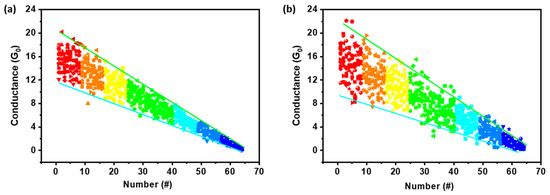 Shrinking the dimension of the conductive filaments (CFs) into the atomic scale of quantum point contact allows memristor ballistic electron transport without scattering and quantized conductance (QC) characteristics in analog domains [24,25,26]. It not only significantly increases the data storage capacity of the devices, but also allows stronger information processing ability in neuromorphic systems. Generally, multiple conductance states of the memristor devices should be achieved in ways that are as simple as possible for practical usage [27,28,29,30]. Nonetheless, most of the studies until now were implemented with complex programming schemes to achieve multi-conductance characteristics, in which the involvement of varying current compliance and voltages leads to a heavy burden on the system circuit design [31,32,33,34]. Advancements are highly desired to simplify the operating philosophy and realize reliable and analog type conductance quantization behavior in resistive switching memristors.