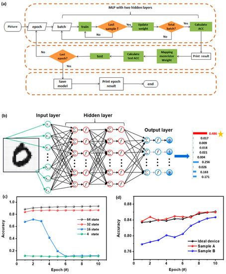 For demonstration, simulation of supervised learning consisted of the offline training of the multilayer perception (MLP) neural network, synaptic weight updating in the memristor array, and tests of the handwritten digit pattern recognition, and was carried out using the experimental quantized conductance characteristics with back propagation (BP) algorithm (Figure 5a). Seven hundred and eighty four 28 × 28 pixel images of handwritten digits are obtained from the Keras database and utilized for training and recognition tests [43]. Accordingly, the as-constructed MLP network contained 784 input neurons, two-layer arrangement of 16 × 16 (256) hidden neurons, and 10 output neurons, with respect to the digits of 0 to 9 (Figure 5b). During the training courses, quantized conductance characteristics with 4, 16, 32, and 64 states were employed to renew the synaptic weights. Actual conductance values were considered and transferred to the synapse array upon normalization. Figure 5c displays the variation of recognition accuracy, along with the increased training epochs and numbers, of the available QC states. As shown, the less effective weight updating of the MLP network with four levels of QC characteristics can only lead to ≈10% recognition of the handwritten digits, while increasing the numbers of the available QC states to 16 may improve the accuracy to 71.2%. Nevertheless, it was observed that as the training courses continue, the recognition rate suddenly drops to ≈10% after six epochs. This can be ascribed to the fact that small numbers of the available QC states may result in lesser amounts of conductance levels available for weight updating and thus larger learning gradients and undesired convergence of the training loss function at the local minimum, which in turn makes the neural network unable to perform the multiplication-and-accumulation (MAC) operations any longer. As a consequence, the training process fails. When the numbers of the QC states reach 32 and 64, the analog manner of the MLP network operation shows promising pattern recognition accuracy of 86.8% and 93.5% after 10 training epochs, respectively, again suggesting the numbers of conductance states will directly affect the final recognition accuracy of the neural network. Only when the conductance levels are higher than 32, the accuracy of the QC based MLP network can be steadily improved with the number of trainings. It was also noteworthy that in the present study the employment of 1-bit operation technically limits the overall computing accuracy of the network. In the case that multi-bit inputs can be projected onto multiple memristor cells, greatly enhanced accuracy can be possible [44,45,46].