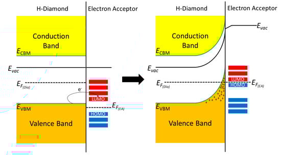Band diagrams showing the interaction of hydrogen terminated diamond with a surface electron acceptor material.