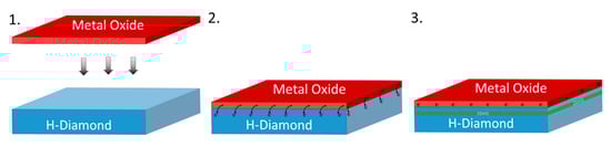 Figure 2 presents a schematic diagram and the conceptual idea showing that when a metal oxide with suitably high electron affinity (~4.3 eV) is deposited on an H-diamond surface, electrons from just below the surface of the diamond will transfer to the metal oxide creating the 2DHG in the diamond. The higher the number of electrons extracted from the diamond substrate to the electron acceptor material, the higher the hole concertation of the 2DHG, which, in turn, reduces resistance and increases maximum current in electrical devices. Hence, it is desirable to maximise the charge transfer density from the diamond to the electron acceptor. Such an optimization of charge transfer is highly challenging when utilising randomly adsorbed species from ambient air on to the H-diamond surface. The species also prove to be unstable at elevated temperatures and offer poor device reliability. Therefore, the optimisation of the composition and structure of thin metal oxide films as alternative electron acceptor layers provides greater potential for engineering the STD process in diamond, and it can result in more robust thermal stability and device reliability.