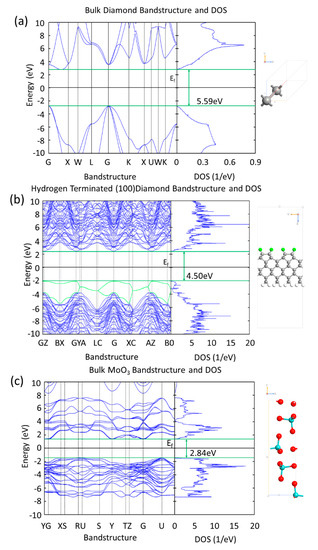 Figure 3 compares diamond, hydrogen terminated diamond and MoO3 band structures and Density of States (DOS) obtained from the unit cell and super cell DFT simulations. The lattice parameters of the three systems in Figure 3, are: (a) bulk diamond—face centered cubic a = 3.574 Å, (b) hydrogen terminated diamond—super cell lattice type a = 2.527 Å, b = 10.108 Å, c = 27Å (the unit cell for the hydrogen terminated 2 × 1 diamond is a = 2.527 Å, b = 5.054 Å and it is in agreement with the experimental values of 2.52 Å and 5.04 Å [35]), MoO3—simple orthorhombic a = 3.962 Å, b = 13.86 Å, c = 3.697 Å. The data that are presented in Figure 3a,b show that, when diamond is hydrogen terminated, the band gap is slightly reduced at the surface due to surface gap states at the valance band maximum (VBM) and conduction band minimum (VBM), because of the presence of hydrogen atoms—the most prominent additional bands from the C–H interaction at the VBM have been highlighted in green in Figure 3b. This is due to the bonding and antibonding C–H states at the VBM and CBM [36]. Although the band gap of the system has been reduced to 4.50 eV, which is shown in Figure 3b, the projected DOS plot for the carbon atoms in the bulk of the structure shows their band gap remains ~5.5 eV. The first two valance sub-bands in Figure 3b, which clearly have higher energies in comparison to the other sub-bands, arise from the interaction of the first layer of carbon with the adjacent hydrogen atoms. If these two sub-bands are ignored the band gap for diamond remains ~5.5 eV.