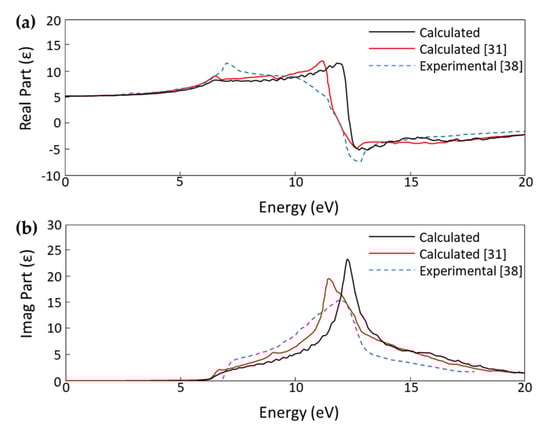 (a) Real part and (b) imaginary part of the calculated dielectric constant (ε) plots for bulk diamond comparing our calculated results with calculated results by Xiang et al. and experimental results by Philipp and Taft [31,38].