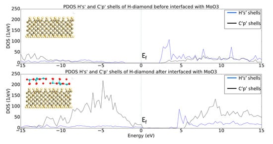 The PDOS diagram reveals that, when the H-diamond is in contact with the MoO3, there is a shift of the PDOS to higher energies and the Fermi Level (EF) is in contact with the valence states. Moreover, the band gap of the diamond remains constant, but states of the Valance Band Maximum (VBM) have crossed the Fermi Level, which in turn means that charge transfer has occurred, as previously occupied states within the H-diamond are now vacant. This demonstrates that the electrons transferred from the diamond surface to the MoO3 layer, leaving the hole accumulation layers, as expected from the STD model. Or, in other words, the shift of the EF from the middle of the bandgap toward the VBM also indicates p-type doping of the H-diamond. This is consistent with the recent experimental and simulation results that were published by other groups [27].