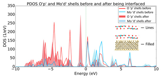 PDOS plot of Op and Mod shells before (lines) and after (filled) being interfaced with the H-diamond. Inset are two-dimensional (2D) crops of the systems being shown in the PDOS, showing that the line and filled plots denote the MoO3 before and after being interfaced, respectfully.