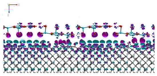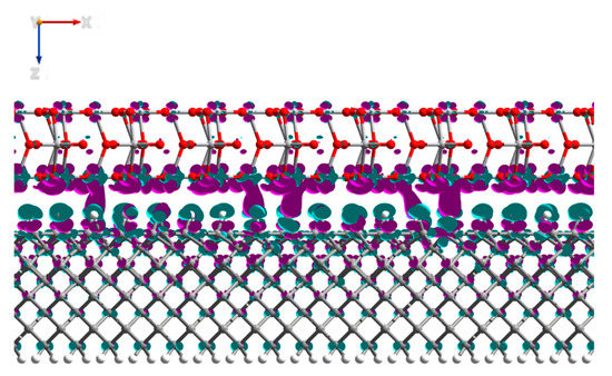 Additional to the PDOS data, we have analyzed the Mulliken charges and electron density differences of the interfaced system. The analysis of the Mulliken electron population of the system presented in Table 2 showed that electron density had transferred from the first four layers of the H-diamond to the MoO3, with negligible change to the electron density of the atoms deeper within the diamond. Consistent with the results that are presented in Table 2 is the image in Figure 7, which shows the electron density change for the MoO3:H-diamond interface. The green regions show where there is a loss of electron density and thus the accumulations of holes, and the purple regions show where there is an increase in electron density. The electron density difference isosurface shows that there is a hole accumulation that occurs near the surface of the diamond, while most of the electron density gained by the MoO3 clearly migrates to the oxygen atoms. Figure 7 and Table 2 are clear representations that the H-diamond loses electrons from the layers closest to the surface, showing that a 2DHG created by surface transfer doping has been formed in the H-diamond. Most of the charge transferred to the MoO3 migrates to the oxygen atoms, rather than the molybdenum atoms with a total transfer of 3.6 electrons from the H-diamond to the MoO3. Moreover, these results are in very good agreement with work by K. Xing et al., where they also demonstrate electron transfer from the H-diamond to the oxide [27].