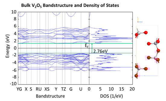 Figure 8 depicts the bandstructure and DOS calculated for bulk V2O5. The band gap calculated is 2.76 eV, which is comparable to the optical bandgap of 2.8 eV reported for 100 nm thick thermally evaporated V2O5 films [39].
