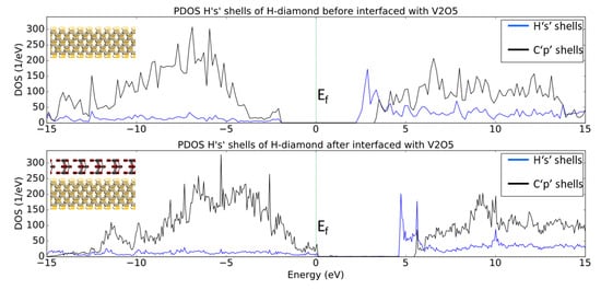 Figure 9 shows the PDOS for the ‘1s’ electron shells of the hydrogen and the ‘2p’ electron shells of the carbon atoms before and after the H-diamond has been interfaced with V2O5. When H-diamond is interfaced with V2O5 there is a shift of the PDOS of the diamond to higher energies with some states now crossing the Fermi Level (EF). Indeed, this is very similar to the observed trend when the H-diamond is interfaced with MoO3, where the VBM is in contact with the EF. This suggests that the diamond has lost electrons as states in the diamond that were occupied before being interfaced, are now vacant. The gap between the VBM and CBM remains the same as the diamond’s bulk band gap value. Additionally, Figure 9 reveals a similar trend regarding the DOS movement to the results that are shown in Figure 5. Indeed, the EF has moved closer to VBM, which indicated that there has been charge transfer at the interface and that the H-diamond has been p-type doped.