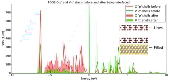 PDOS plot of Op and Vd shells before (lines) and after (filled) being interfaced with the H-diamond. Inset are 2D crops of the systems being shown in the PDOS, showing that the line and filled plots denote the MoO3 before and after being interfaced, respectfully.