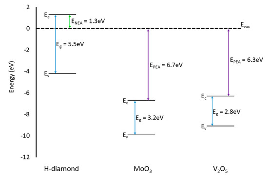 Energy band diagram showing the VBM and CBM positions for H-diamond (left hand side), MoO3 (middle), and V2O5 (right hand side) [30,40,41].