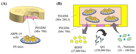 Overview of the cell-encapsulation device. (A) A 3D printed capsule with ARPE-19 cells enclosed inside the device. ARPE-19 cells were cultured in polystyrene (PS) sheets. (B) Cross-section of device in A. The 3D printed capsule with semi-porous membrane (PEGDM) allowed selective permeability of brain-derived neurotrophic factor (BDNF; 27 kDa), O2, and nutrients (16–180 Da) while protecting the cells from the immune response of the body (i.e., immunoglobulin (IgG; 150 kDa)).