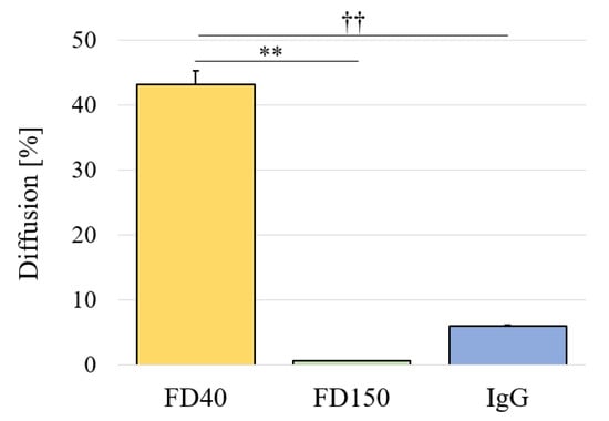 Graph of percentage diffusion of different FITC-conjugated dextran and immunoglobin G (IgG) taken at day 7 (n = 3 for each group). The experiment was conducted in 12-well transwell inserts by replacing the insert’s original PET membrane with a PEGDM membrane (thickness: 100 μm). Error bar indicates standard deviation; ** and †† indicate p < 0.00005 and p < 0.00001 respectively.
