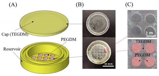 The cell encapsulation capsule consisted of two parts: the cap and the reservoir. Both parts were designed in Solidworks 2018 (Dassault Systèmes, Vélizy-Villacoublay, France) and 3D printed (layer thickness: 50 um) (QiDi tech shadow 5.5 s, QIDI Technology Co., Ltd., Ruian, China) using either TEGDM (cap) or both TEGDM and PEGDM (reservoir) resins (Figure A1). To print the cap, each layer of TEGDM resin was exposed for 8 s (first layer was exposed for 30 s to allow adhesion to the build plate). However, to print the reservoir, a semi-autonomous approach was used. The first layer (exposure time: 30 s) was printed with TEGDM. Then, the printer was paused and the build plate was removed, followed by build plate cleaning with 95% ethanol. TEGDM resin was replaced with PEGDM, and second layer was printed (exposure time: 40 s). The printer was again paused, the build plate removed and washed with ethanol. Then, PEGDM resin was replaced with TEGDM, and the remaining layers were printed normally with TEGDM resin (exposure time: 8 s). After the parts were fully printed, they were washed with 95% ethanol for 1 min and post-cured in a UV box (50 W, 405 nm) for 5 min. Finally, both parts were soaked in 50% ethanol for 72 h to remove the photo initiator and the photosensitizer to improve biocompatibility of the device [23]. A detailed fabrication procedure is shown in Figure A1.