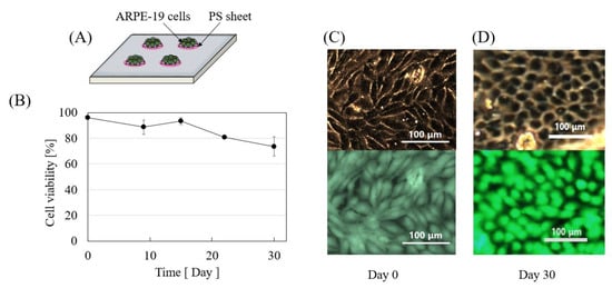 Cellular viability of ARPE-19 cells in collagen coated PS sheets. (A) Cells were cultured on collagen coated 5 mm diameter PS sheets. (B) ARPE-19 cells maintain over 75% cell viability for at least 30 days on the PS sheet (n = 3). Morphology of confluent monolayer cells are similar for both (C) day 0 and (D) day 30.
