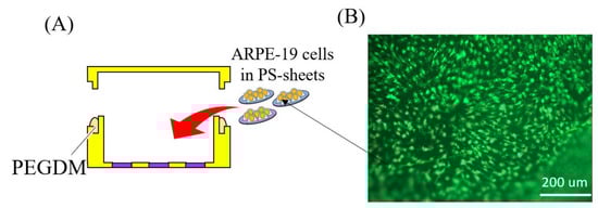 Cellular viability of ARPE-19 cells inside cell encapsulation capsule. (A) Conceptual image of the cell cultured PS sheets encapsulation process. (B) Image of ARPE-cells in 5 mm PS sheets on day 3.