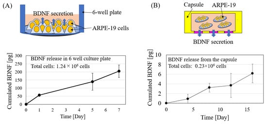 Total amount of BDNF collected from ARPE-19 cultured in (A) 6-well plate and (B) cell-encapsulated capsule. Image inserts show illustration of the experiment conducted. The error bars indicate standard deviation (n = 3 samples for each group).
