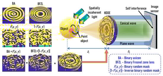 The HDOE was designed with only two levels. The self-interference is formed between two waves, namely a spherical wave and a conical wave, which are generated by a Fresnel zone lens and an axicon respectively. The binary Fresnel zone lens is multiplied by a binary random matrix with a particular scattering ratio and the binary axicon is multiplied by the inverse of the same binary random matrix. The resulting matrices are added to obtain the binary HDOE, as shown in Figure 1. The light from the point object is incident on the HDOE, which consists of two components, namely a Fresnel zone lens and an axicon. The Fresnel zone lens collimates the incident light when the object plane matches with the front focal plane of the Fresnel zone lens, while the axicon generates a Bessel-like beam. Due to the random multiplexing and the binary profile of the two elements, the generated beams are slightly different from that of the expected ones with some multiplexing noise and effects of higher diffraction orders. These two beams interfere in the sensor plane to produce a Bessel-like self-interference pattern with multiplexing noises. This is the point spread intensity distribution. For a complicated object, every independent point of the object generates their own intensity pattern, which are shifted and scaled depending upon their 3D location and are added in the sensor plane. Any change in the wavelength or depth generates a unique signature due to the wavelength- and depth-dependent diffractive effects of the HDOE.