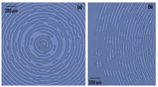 Optical microscope images of the (a) central and (b) outermost part of the HDOE fabricated using electron beam lithography. The dark blue color indicates the resist remained and the light blue color indicates the resist was removed.