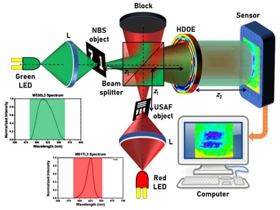 The experimental demonstration was carried out using two LEDs (M617L3, λc = 617 nm, full width at half maximum (FWHM) = 18 nm; M530L3, λc = 530 nm, FWHM = 33 nm), which were spatially incoherent and had low temporal coherence owing to the larger values of the FWHMs. It must be noted that the previous studies [,,,,,] were carried out with temporally coherent sources with a FWHM of 1 nm. A pinhole with a diameter of 20 µm was used to simulate the point object. Two standard objects, namely the United States Air Force (USAF) resolution target (group 2, element 6, 7.13 lp/mm) and the National Bureau of Standards (NBS) resolution target (7.1 lp/mm), were used to generate two plane objects with different thicknesses and wavelengths. The schematic of the two-channel experimental setup is shown in Figure 3. The light from the two LEDs were collected using two identical lenses L with a focal length of 10 cm that critically illuminated the two objects. The light that formed the two channels were combined using a beam splitter (BS). The light that diffracted from objects was modulated using the HDOE and the self-interference intensity distribution was recorded using an image sensor (Thorlabs DCU223M (Thorlabs, Newton, NJ, USA), 1024 × 768 pixels, pixel size = 4.65 μm).
