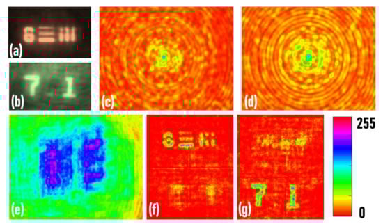 Direct imaging of the (a) USAF and (b) NBS objects. Point spread holograms recorded for (c) λc = 617 nm and (d) λc = 530 nm. (e) Object hologram recorded when the USAF and NBS objects were at the same distance from the HDOE. (f,g) The reconstruction results using (c) and (d), respectively. The scale corresponds to the pixel intensity recorded by the image sensor.