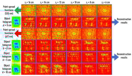 In the final experiment, the four-dimensional imaging capabilities were evaluated by changing the relative distances between the two objects. In this way, the recorded holograms contained spatially and spectrally varying information across it. The distance between the NBS and USAF objects along the z-direction was varied using d = 0, 5, and 10 cm and the corresponding holograms were recorded. The holograms were reconstructed using point spread functions of the two wavelengths 530 nm and 617 nm recorded at z1 = 6 cm to 16 cm in steps of 2 cm. From the reconstruction results shown in Figure 5, it was observed that the system could distinctly resolve the axial and spectral information.