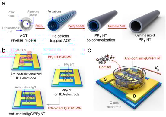 Among the family of CPs, PPy nanomaterials have been the most extensively investigated due to their unique properties, including a simple synthesis procedure, excellent electrical conductivity, high biocompatibility, and environmental stability [,]. In particular, PPy nanomaterials with different nanostructures and morphologies have been utilized as appropriate electrical channel elements for FET sensors []. The synthesis of PPy NTs involves two main steps, as illustrated in Figure 1a. PPy NTs, which have a tubular structure, were synthesized with the aid of cylindrical micelle templates in an apolar solvent. Copolymerization of Py with pyrrole-3-carboxylic acid on the surface of a cylindrical micelle yielded intrinsically functionalized PPy NTs []. This structure-guiding agent-based polymerization did not require a high temperature, strong acid, or strong base to remove the template after polymerization.