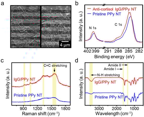 Characteristics of synthesized, functionalized polypyrrole (PPy) nanotubes (NTs). (a) SEM images before (i) and after (ii) conjugation of anti-cortisol IgG onto the surface of PPy NTs. PPy NTs were immobilized on the Au fingers of the IDA electrode, and their surfaces were modified with IgG using a condensing agent, DMT-MM. (b) X-ray photoelectron spectroscopy (XPS) spectra, (c) Raman spectra, and (d) FT-IR analyses of unmodified PPy NTs and anti-cortisol IgG-modified PPy NTs.