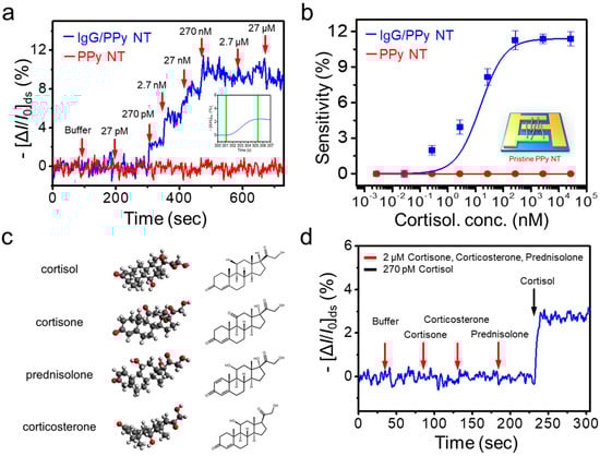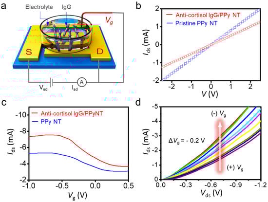 Figure 3c depicts the transfer characteristics (Ids–Vg, where Ids is the source–drain current and Vg is the gate voltage) of our FET-type biosensor device following treatment and immobilization of IgG. To measure the transfer characteristics of the FET sensor, a constant bias voltage Vds of −1 mV was applied across the S and D electrodes. Vg was applied by immersing the Pt reference electrode in the phosphate-buffered saline electrolyte on the top of the PPy NT FET sensor. The hysteresis was tested at the fixed gate voltage range, the current gap at the different direction sweep was observed by ΔIds = 0.1 mA at Vg = −0.6 V (Figure S3) []. Upon conjugation of IgG with the PPy NT surface, the transfer curve shifted. Normally, an antibody is an amphoteric electrolyte composed of many carboxyl and amino bases. The isoelectric point (pI) of IgG, including its anti-cortisol antibody, is approximately pH 5.0–5.5 []. Hence, the charge state of the IgG became negative at pH 7.4 in our measurements []. Although the PPy NT FET sensor changed the current, it maintained typical p-type semiconductor characteristics. This result clearly indicated that the fabricated PPy NT FET device was able to sensitively detect the modulation of charges at the surface of its PPy NTs, in addition to reflecting significant changes in the FET channel in terms of the current–voltage responses. Based on these observations, the interactions of PPy NTs after each modification step, as well as the responses to varying concentrations of cortisol, can be evaluated by measuring the changes in current–voltage characteristics.