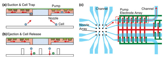 Figure 1. The schematic of a nozzle array integrated with electrokinetic pumps for cell manipulation. (a) Suction and trap of single cells in an array format with nozzles. (b) Ejection and release of the cells from the nozzles. (c) Schematic view of 4 × 4 nozzles integrated with pumps. One of the electrodes (green) is connected to a signal voltage (DC-biased AC voltage) and the other electrode (red) is connected to the ground.