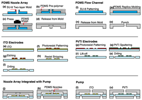 Figure 2. Fabrication process of the nozzle array integrated with pump. (ad) Fabrication of polydimethylsiloxane (PDMS) nozzles. Uncured PDMS was pressed by a PDMS sheet to form PDMS through holes. (ei) Patterning of OFPR photoresist on indium tin oxide (ITO) substrate and formation of ITO electrodes. ITO was etched with hydrochloric acid. (j,k) Bonding of the PDMS micronozzles, ITO electrodes, and a PDMS sheet after plasma treatment. (lo) Fabrication of PDMS flow channel. (ps) Patterning of Pt/Ti electrodes. (tu) Bonding of the PDMS microchannel, ITO, or Pt/Ti electrodes, and a PDMS sheet after plasma treatment.
