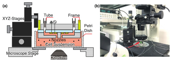 Figure 3. The experimental setup for cell manipulation with a developed nozzle array. (a) Schematic and (b) picture of the setup. A nozzle array was mounted on the XYZ stage via a 15 mm × 15 mm stainless frame. Electrodes were connected with AC power sources and ground (GND). In the channel of a nozzle array, particle suspension was introduced and HeLa cells were suspended in a petri dish.