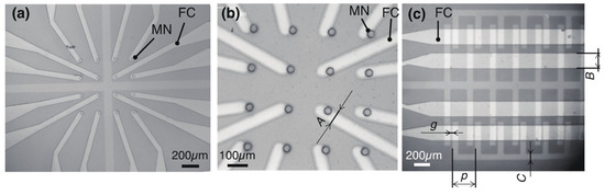 Figure 4. Micrographs of micro-nozzles integrated with ITO micropumps. (a) 4 × 4 micro-nozzles connected with micro-channels. Nozzle and channel were fabricated in the transparent materials PDMS and glass, which enabled observation of any transmission. (b) Close-up view of a micro-nozzle array. (c) Four series of flow channels and electrodes. FC and MN denote flow channel and a micro-nozzle, respectively. Typical dimensions were measured from five points: Nozzle diameter 34.8 μm. Channel width, A = 62.0 μm. B = 189.1 μm. Height, H = 71.9 μm. Electrode width, C = 71.9 μm. Gap g = 27.8 μm. Pitch p = 278.8 μm.