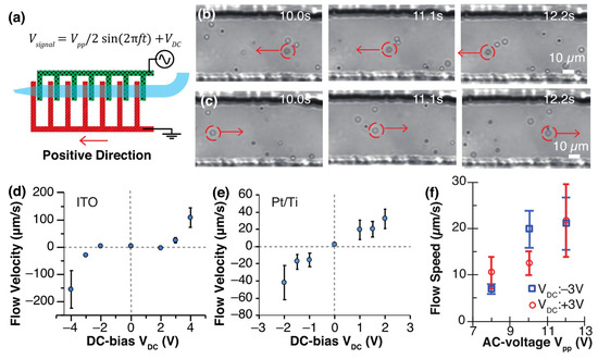 Figure 5. Generation of DC-biased AC electrokinetic flow with an ITO or Pt/Ti pump. The frequency and peak-to-peak voltage of the AC signal were set to 100 kHz and Vpp 10 V, respectively. (a) Schematic diagram of the pump. Particle transportation with an ITO pump at (b) VDC +3 V and (c) VDC –3 V. Electrokinetic flow velocity versus DC bias with (d) ITO and (e) Pt/Ti electrodes. (f) Flow speed versus Vpp voltage with ITO electrodes. Flow velocity was measured from 10 particles moving in the channel.