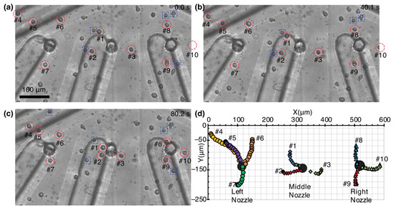 Figure 6. Suction of 10 cells using an electrokinetic pump near three nozzles (100 kHz, 10 Vpp, VDC −4 V). (ac) Time-lapse images of cell suction. Voltage was applied at 0 s and the flow was continuously generated. The 10 cells are circled by a red dashed line and attracted cells are boxed by a blue dashed line. (d) Trajectories of the aspirated 10 cells.