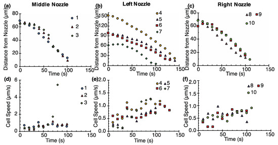 Figure 7. Characterization of parallel single cell suction. (ac) Relationship between the distance of single cells from the nearest nozzle and time. (df) Relationship between the speed of the cells and time.