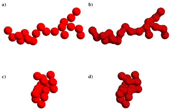 The spherical primary particles forming the aggregate generated by the particle-cluster method are tangent. To avoid numerical problems in the region of the contact point, we perform a Boolean union operation of the spheres with a set of cylinders connecting the centers of the spheres in contact (that are readily identified since the generation algorithm provides the connectivity list). The radius of the cylinders is chosen . We have verified that, by reducing the cylinder radius, the rotational dynamics and the resulting intrinsic viscosity is weakly affected. The aggregate surface is, then, smoothed and meshed. These operations are performed through the library PyMesh [32]. Examples of the surface meshes for the aggregates in Figure 1a,c are shown in Figure 1b,d. The volume mesh, that is the mesh between the external spherical domain and the aggregate, is made by tetrahedral elements and is generated by Gmsh [33].