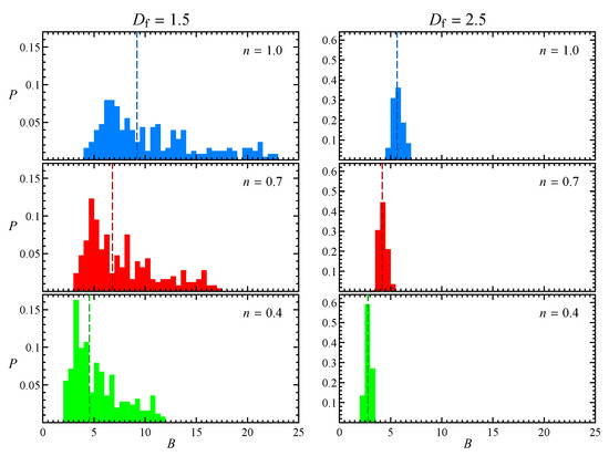 Figure 2 shows the probability distribution of the intrinsic viscosity with respect to the same initial orientations considered to build the look-up table, for the two aggregates reported in Figure 1 and three flow indexes. The dashed lines represent the medians of the distributions, which are all approximately unimodal. Comparing the results for different fractal dimensions, it can be seen that at lower the distribution of the intrinsic viscosity is wider, as the particles are more anisotropic and their orientation becomes more relevant. In particular, B is higher when the aggregate is aligned with the gradient direction (i.e., y), and lower when it is aligned with the flow or vorticity direction, similarly to prolate spheroids. On the other hand, the distribution variance reduces at higher as the particles are more sphere-like. In agreement with the results for a sphere in power-law fluid [25], shear-thinning determines a reduction of the intrinsic viscosity, but the shape of the distribution remains the same.