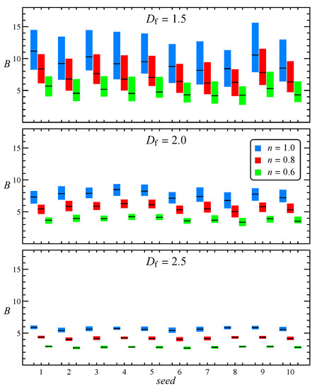As stated above, to make the results independent of the specific random seed used to generate the aggregates, for every combination of the other parameters, we repeat the simulations with ten different seeds. The effect of the specific morphology on the intrinsic viscosity distribution is reported in Figure 3 with a box plot showing the first, second (i.e., the median), and third quartile of every distribution. In all cases we find again the same trend seen in Figure 2 with fractal dimension and flow index, whereas the effect of the random seed is of secondary importance.