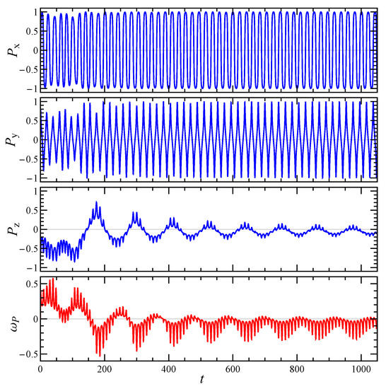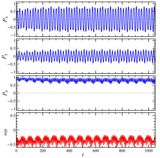 Since the intrinsic viscosity depends on the particle orientation, which changes with time due to the imposed shear flow, it is important to reconstruct the particle dynamics. The rotational dynamics of an irregularly shaped aggregate can be better understood by looking at its principal axes of inertia. Specifically, let’s denote with the principal axis corresponding to the smallest moment of inertia, which for an elongated particle (small ) corresponds to its ‘natural’ orientation. Figure 4 and Figure 5 show the time evolution of the Cartesian components of and the angular velocity around it , for the aggregate reported in Figure 1b and two initial orientations. In both cases the orientational dynamics is rather complex and neither a steady-state nor a simple periodic regime is achieved. Two periods can be recognized, one shorter connected to the rotation around the vorticity axis z, and one longer connected to the rotation around . When the particle starts with an orientation close to the z-axis (see Figure 4), it undertakes a kayaking-like dynamics with approximately elliptical orbits around the z-axis, more elongated in the x-direction. On the other hand, when the initial orientation is sufficiently far from the z-axis (see Figure 5), the particle tends to align with the shear plane, that is, progressively reduces, similar to a tumbling motion. At the same time also decreases, thus determining an extension of the rotation period around . The same qualitative behavior of the aggregate dynamics is observed for shear-thinning fluids.