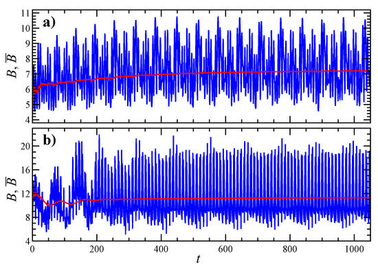 Once the particle orientational dynamics is known, the time evolution of intrinsic viscosity B and time-average intrinsic viscosity can be reconstructed. Figure 6 shows the trend of B and for the trajectories seen in previous figures. Specifically, panel Figure 6a refers to Figure 4 (where the particle undertakes kayaking) and panel Figure 6b refers to Figure 5 (where the particle tumbles close to the shear plane). In both cases, while B continues to oscillate due to the aforementioned dynamics, after a certain time, reaches a steady state condition. Notice that such steady state values are different for the two initial orientations considered. is lower in Figure 6a since the aggregate is mainly aligned with its longest axis towards the vorticity direction. Conversely, is higher in Figure 6b since, during the aggregate tumbling motion, periodically passes close to the gradient direction, which corresponds to the maximum intrinsic viscosity.