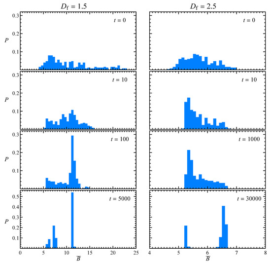 By repeating this procedure for many orientations, it is possible to obtain the evolution of the probability distribution of the time-average intrinsic viscosity, as reported in Figure 7 for the usual two aggregates and . Notice that the initial distributions are the same of Figure 2. As just seen in the previous figure, for low fractal dimension more than one steady state value is present, with the majority of initial orientations leading to dynamics like the one in Figure 6b with . The two lower peaks visible for at correspond to approximately aligned with the positive (shown in Figure 4) or negative (not shown) vorticity direction. These last two peaks are close but not equal since the aggregate has no symmetries. A similar behavior can be observed at high fractal dimension, but with a longer time needed to reach the steady state. The two peaks visible for at are still related to the kayaking and tumbling motion. However, those related to alignment of to the vorticity direction or its opposite are not distinguishable because of the more isotropic particle shape.