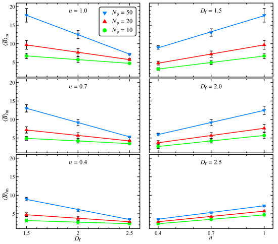 Finally, averaging on all the initial orientations and random seeds we get the ensemble-average intrinsic viscosity defined in Equation (22). Figure 8 reports the dependency of on the fractal dimension and flow index, parametric in the number of primary particles, together with standard deviation and trend line. In the range considered, decreases with and increases with . The decreasing trend of with the fractal dimension, previously observed for Newtonian fluids [11], is related to the aggregate shape and can be justified recalling that the intrinsic viscosity of a suspension of rod-like particles is higher than the one for a suspension of spheres [7]. For the same reason, the number of primary particles forming the aggregate weakly affects the intrinsic viscosity at high fractal dimension. On the contrary, has a strong influence on for low values of . Indeed, for a sphere-like aggregate the number of primary particles only defines its resolution, whereas for a rod-like aggregate it is connected to the aspect ratio that, in turn, determines the viscosity of the suspension [7]. As regarding the effect of the flow index, in agreement with the previous literature for suspensions of spherical and spheroidal particles [14,16,25], shear-thinning reduces the intrinsic viscosity. Specifically, as visible on the right column of Figure 8, in the investigated range the intrinsic viscosity linearly depends on the flow index. As expected standard deviation is lower for high fractal dimensions, since both initial orientation (see Figure 2) and random seed (see Figure 3) have a relatively minor effect.