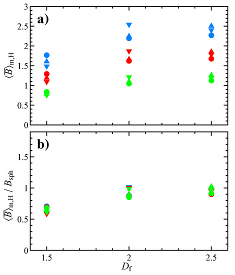 Figure 9a shows the trend of , in which the values of are taken from the literature [23,34]. Some remarks are in order: (i) Equation (23) and the used hydrodynamic radii assume that the aggregate is made of tangential spherical particles, (ii) the values of are calculated for an aggregate suspended in a Newtonian fluid (notice that the calculation of the hydrodynamic radius for a power-law fluid is not straightforward as, due to the non-linearity of the constitutive equation, the mobility tensor cannot be used for its evaluation). Despite these approximations, the data scale fairly well with respect to the number of primary particles (symbols with the same color in figure). As a consequence of the previous normalization, at high fractal dimension tends to the value for a spherical particle (i.e., 2.5 in the Newtonian case) [11]. This motivates us to further normalize the data with respect to the intrinsic viscosity of a dilute suspension of spheres in a power-law liquid, given by [14,25,35]. As visible in Figure 9b, all the data collapse on a single curve. Hence the viscosity of a dilute suspension of aggregates (with the same fractal parameters) in a power-law fluid is completely determined by the fractal dimension. Of course, the prediction of the intrinsic viscosity form the master trend in Figure 9b requires the knowledge of the hydrodynamic radius of the aggregate population.