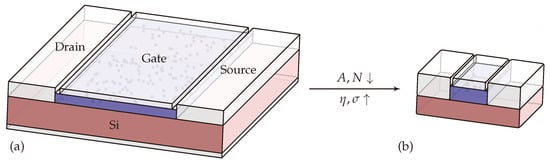 With shrinking of the gate area of a MOSFET, the average number of defects present in the oxide decreases, see Figure 1. The smaller number of defects, however, does not lead to a reduction in threshold voltage shift or noise power, as one might intuitively expect. This is due to the larger influence defects in scaled devices have on the channel [,]. Below a certain gate area, single charge transitions can be observed as discrete steps in the drain current, enabling the characterization of RTN. While for large-area and nanoscale devices a similar average degradation of the threshold voltage can be observed, device-to-device variability is seriously affected by device scaling [,]. As a consequence, accurate characterization of nanoscale devices requires a higher number of samples than required for large area device studies. For this, we measure RTN on more than 300 scaled devices to evaluate the impact of defects on these devices. We further analyze part of the defects in more detail using an analytical approximation, to determine their distribution in depth and energy. Finally, we use numerical defect simulation to reproduce some of the defects’ charge trapping kinetics and compare the obtained distributions to the distributions from the analytical approximation and literature data.